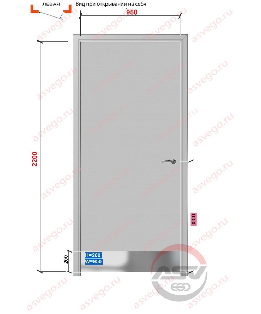 Описание параметров: Количество створок:одностворчатая; Тип открывания двери:распашная; Модификация полотна:глухое; Материал полотна:пластик; Отделка полотна:ПВХ; Толщина полотна:38; Комплектация:коробка; Цвет:Серый 7035; Высота полотна мм:2200; Ширина полотна мм:950; Высота нижней нержавеющей накладки мм:200; Ширина нижней нержавеющей накладки мм:940; Расстояние от нижнего края полотна до верхней кромки нижней нержавеющей накладки мм:200; Тип ручки:нажимная заводская; Тип ручки:нажимная заводская на втором полотне; Расстояние от нижнего края полотна до центра отверстия под ручку мм:1050; Фрезеровка под петли:нет; Отверстие под ручку:есть; Фрезеровка под замок:заводская; Алюминевый торец:нет; Алюминевый торец на втором полотне:нет; Автоматический порог:нет; Сторона открывания:левое; Тип дверного профиля:ДКТ80;