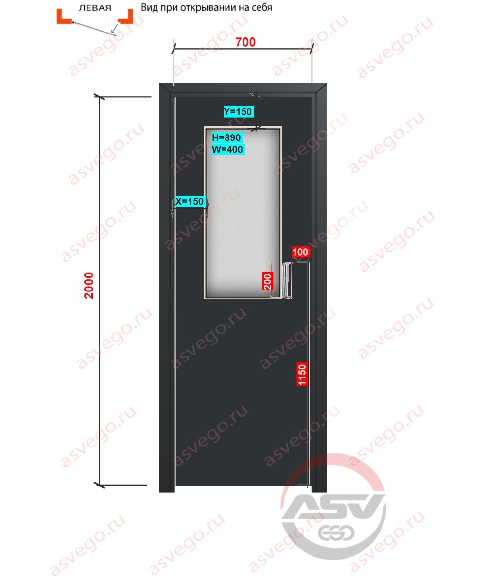 Описание параметров: Количество створок:одностворчатая; Тип открывания двери:распашная; Модификация полотна:остекленное; Материал полотна:пластик; Отделка полотна:ПВХ; Толщина полотна:38; Комплектация:коробка; Цвет:RAL 7021; Высота полотна мм:2000; Ширина полотна мм:700; Ширина проема под остекление мм:400; Высота проема под остекление мм:890; Расстояние от верхнего края полотна до верхней кромки проема под остекление мм:150; Расстояние от края полотна со стороны петель до вертикальной кромки проема под остекление мм:150; Тип ручки:скоба своя; Тип ручки:нажимная заводская на втором полотне; Расстояние между осевыми точками крепления ручки скобы мм:200; Расстояние от края полотна со стороны замка до центра отверстия под ручку скобу мм:100; Расстояние от нижнего края полотна до центра отверстия под ручку скобу мм:1150; Фрезеровка под петли:нет; Отверстие под ручку:есть; Фрезеровка под замок:заводская; Алюминевый торец:нет; Алюминевый торец на втором полотне:нет; Автоматический порог:нет; Тип стекла:4 мм прозрачное; Сторона открывания:левое; Тип дверного профиля:ДКТ80;